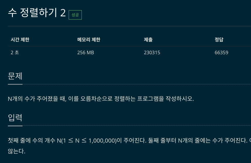아래는 단순한 정렬을 물어보는 문제. N의 크기는 최대 1,000,000이고, 시간제한은 2초. 컴퓨터가 1초에 1억개의 연산을 할 수 있다고 가정할 때, 2억개의 연산을 할 수 있다. 즉 O(N^2) 알고리즘으로는 풀 수 없다. 이 문제는 O(N log N) 이하의 알고리즘으로 풀어야 한다.