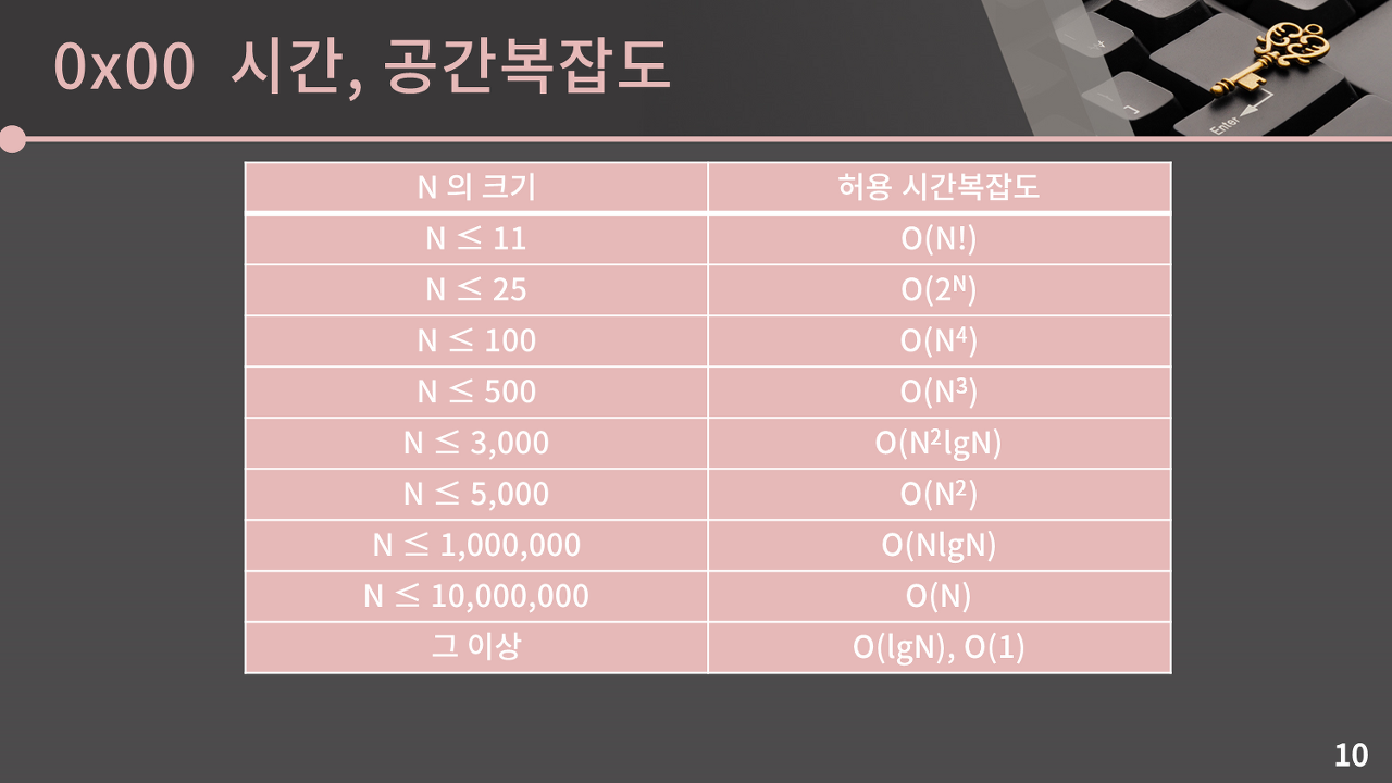 바킹독님의 강의를 보면서 시간제한에 대한 노하우를 추가적으로 배우고 있다. 이 분은 N의 크기를 더 보수적으로 상정하신다.