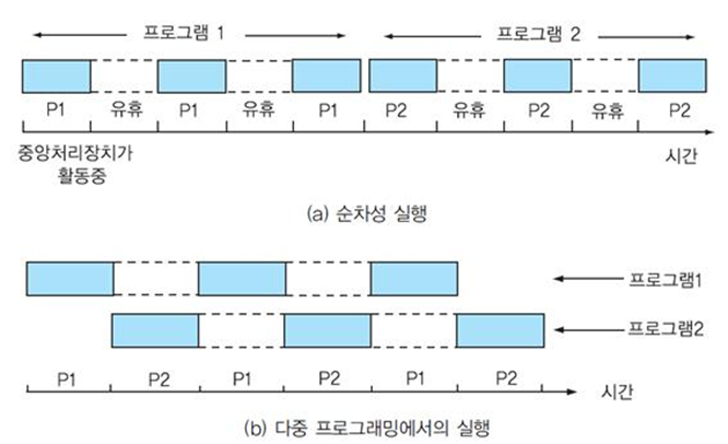 인터럽트가 없다면 다중프로그래밍의 구현은 사실상 불가능하다. 다중 프로그래밍의 핵심은 A 프로세스가 입출력을 시작했을 때 입출력이 완료될 때까지 A 프로세스를 중단 상태로 만들고 B 프로세스를 실행하게 하여 CPU 사용률을 높이는 것이기 때문이다.