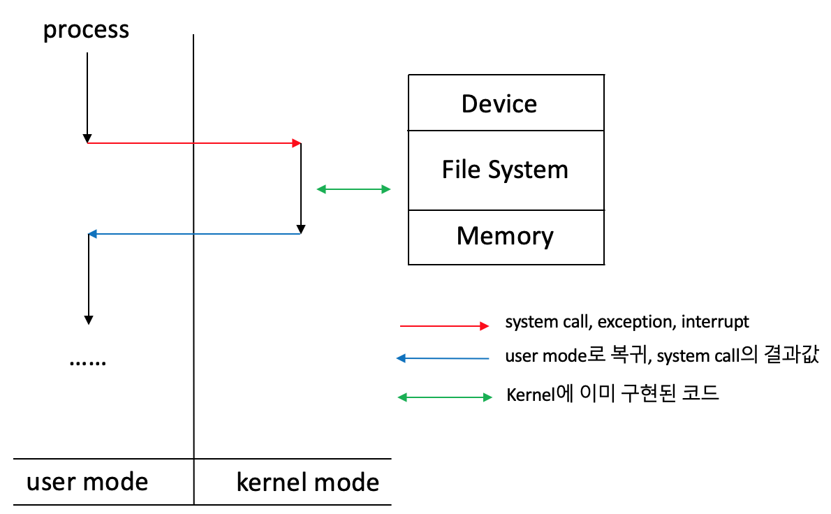 프로세스는 두 모드중 하나의 모드만을 가지는 것이 아니라, 실행되는 동안 수없이 유저모드와 커널모드를 반복하면서 실행된다.
