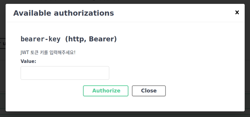 Authorize 버튼을 클릭하면 인증 키 (내 프로젝트의 경우 JWT access token)를 입력할 수 있다.