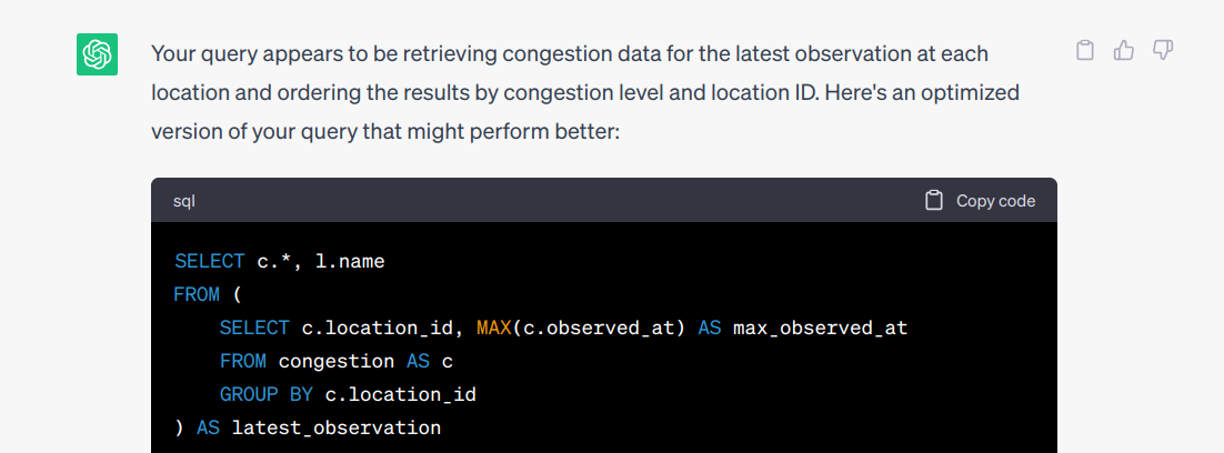 congestoin 엔티티에 ('location_id', 'observed_at') 으로 복합 INDEX를 지정하면 쿼리문 최적화가 된다고 한다.