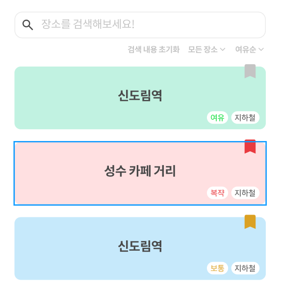 아래 사진은 와이어프레임인데, 각 카드 하단의 '여유', '복쟉', '보통'이 각 로케이션의 가장 최근 혼잡도 레벨이다.