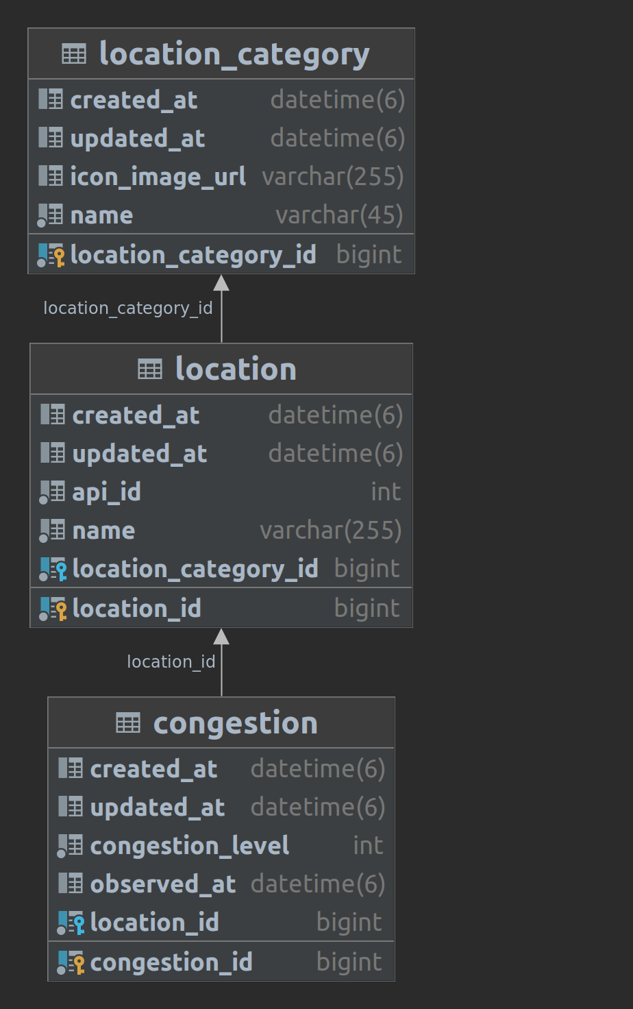 엔티티로는 로케이션이 있고, 각 로케이션에 대해서 서울시 인구 혼잡도 API로부터 5분마다 혼잡도 데이터를 적재한다.