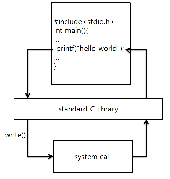 응용 프로그램이 디스크 파일을 접근하거나 화면에 결과를 출력하는 등의 특권 명령(Privileged Instructions)을 수행해야 하는 경우, 커널에게 특권 명령의 대행을 요청하게 된다.