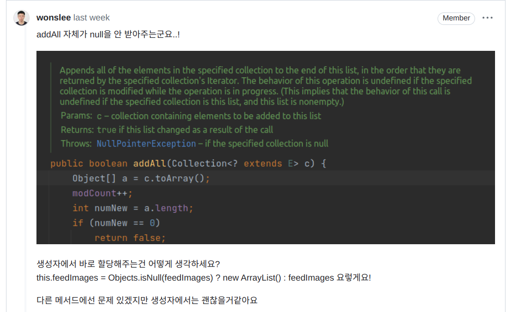 애초에 addAll에 NULL 인자를 주면서 생긴 문제이지, addAll 자체의 문제가 아니기 때문이다.