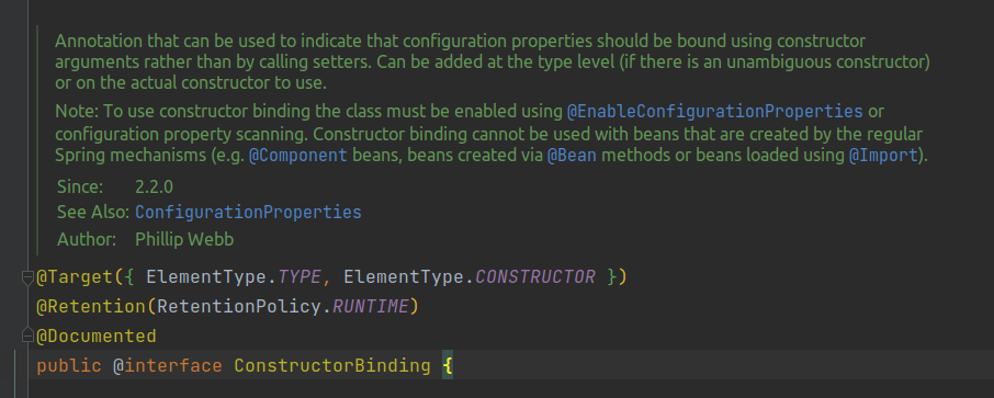 ConstructorBinding : 설정 프로퍼티(@ConfigurationProperties 적용된 클래스) 인스턴스 변수가 setter보다는 생성자 인자로써 바인딩된다는 것을 명시하는 어노테이션.