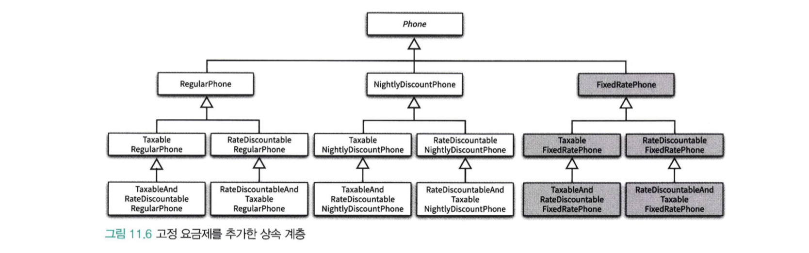 만약 Phone을 중심으로 경우의 수를 상속으로 해결한다면 클래스의 개수가 폭발적으로 증가한다.